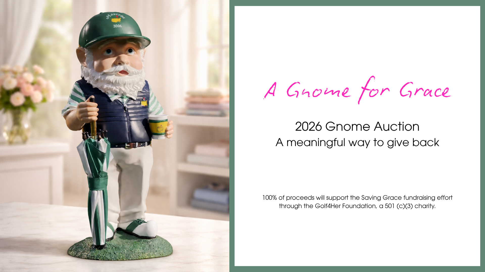 By auctioning this gnome, we are turning something rare into something meaningful. Every bid directly supports the Saving Grace fundraising effort through the Golf4Her Foundation.